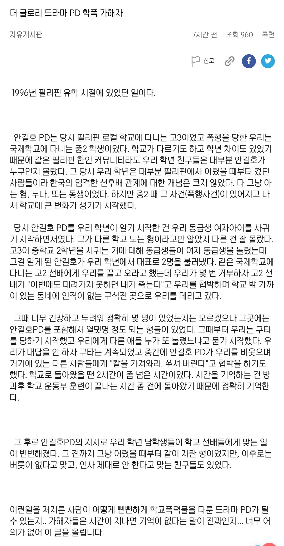 더글로리 안PD 학폭 논란 장소가 필리핀 유학 시절이라...